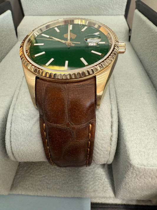 Gold Tone Dial Men's Leather Band Golden Buffalo Watch with Green Dial